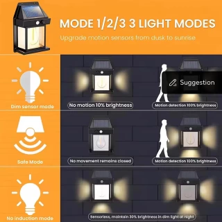Enhance outdoor security and ambience with our Solar Induction Wall Lamp. Featuring 3 lighting modes, smart motion sensor, and IP65 waterproof design for reliable, energy-saving night lighting.